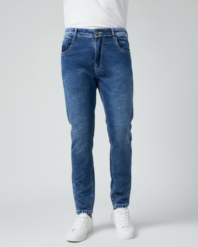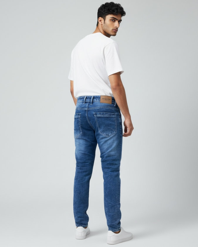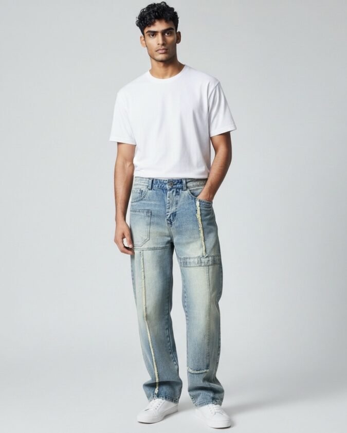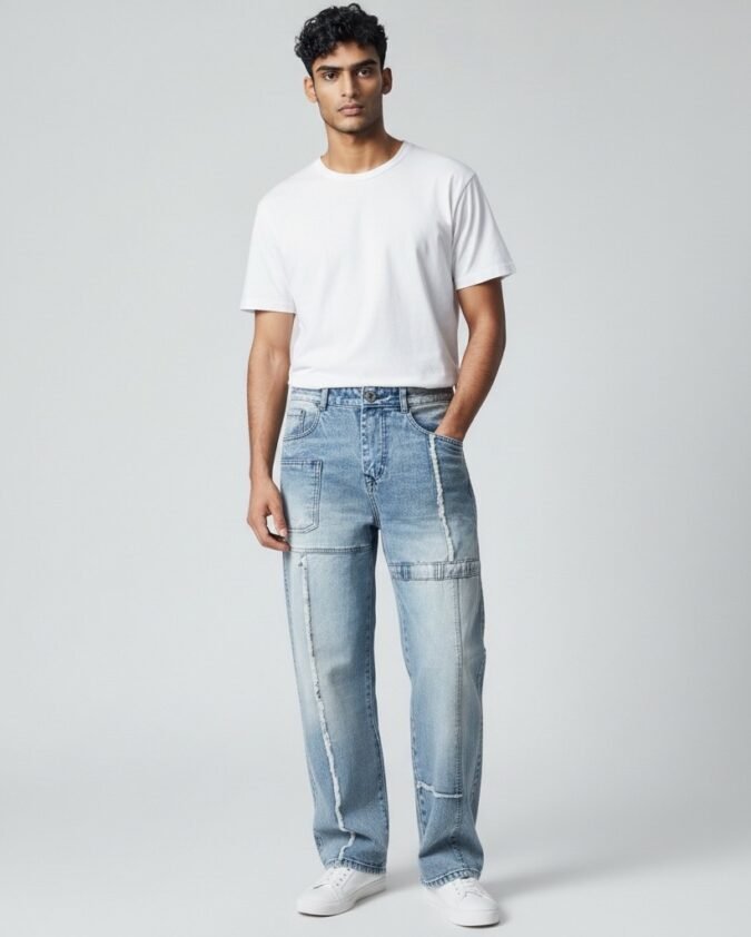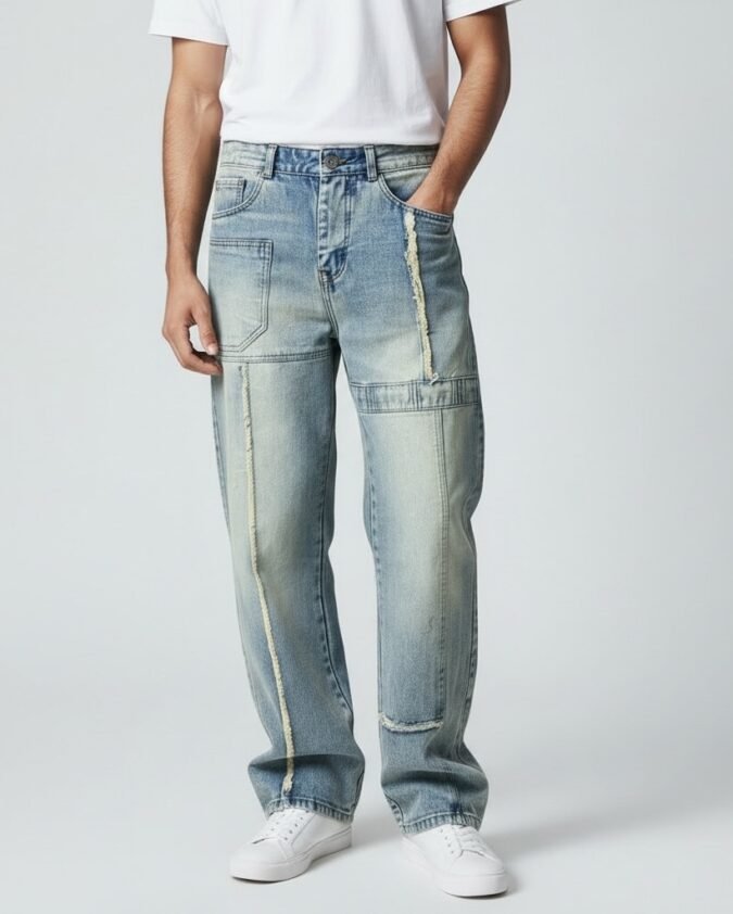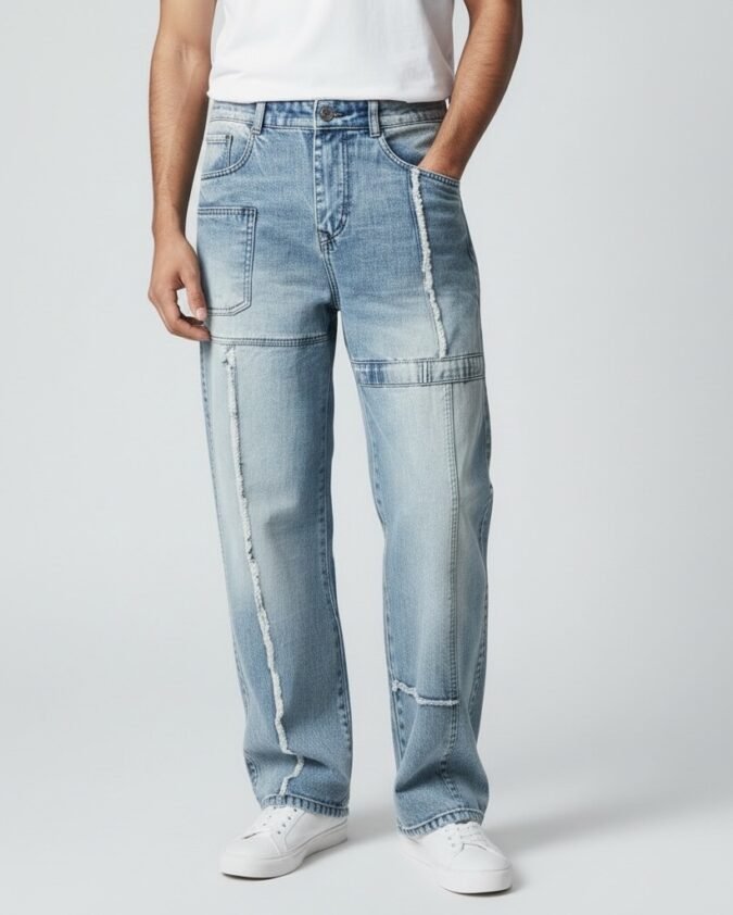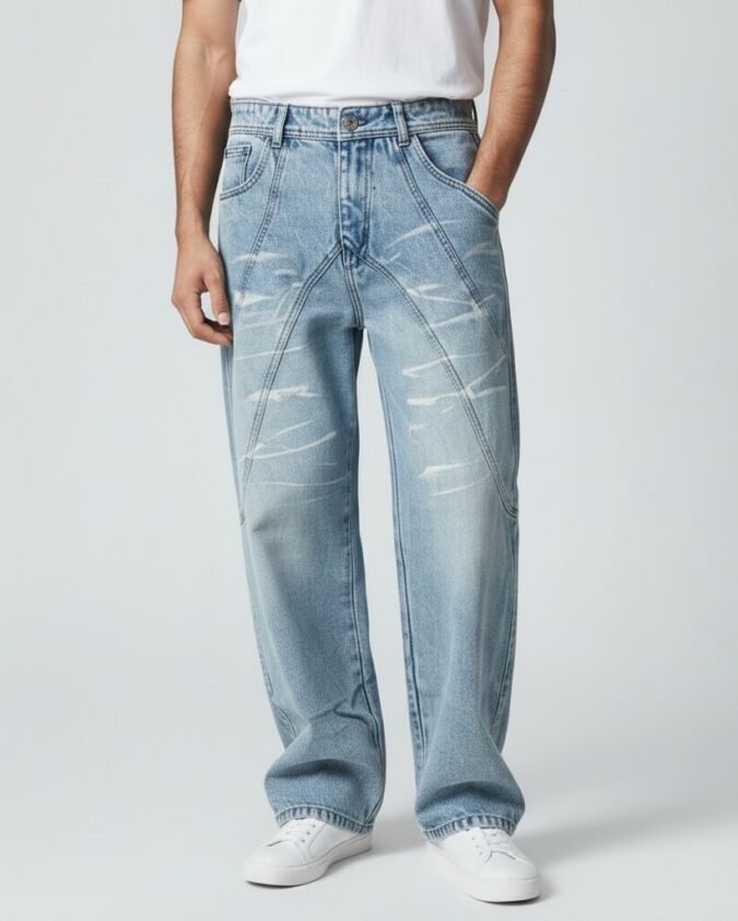 Men’s Panel Stitch Casual Blue Baggy Fit Jeans-001