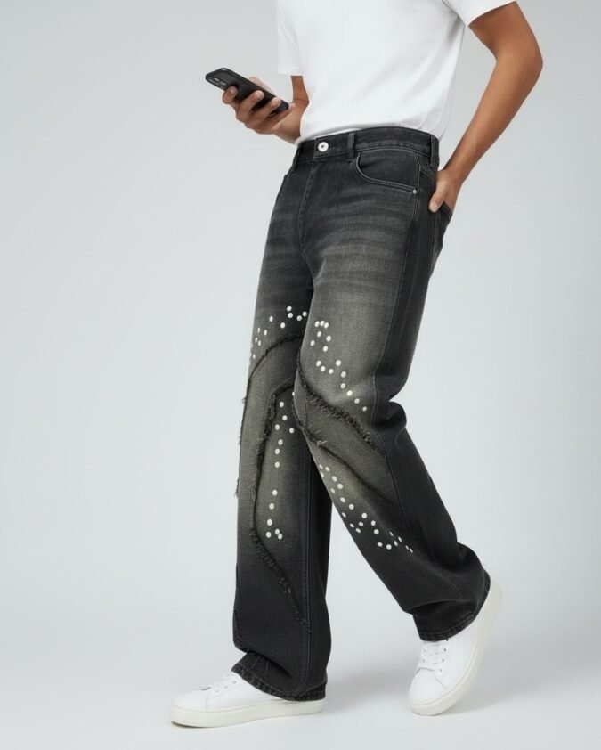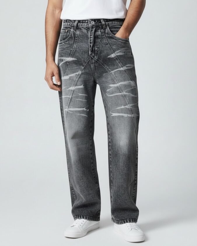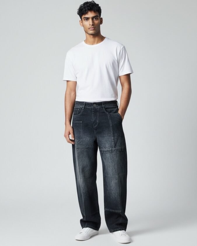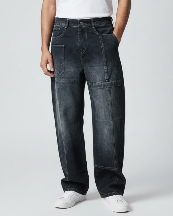 Men’s Panel Stitch Casual Black Baggy Fit Jeans-002