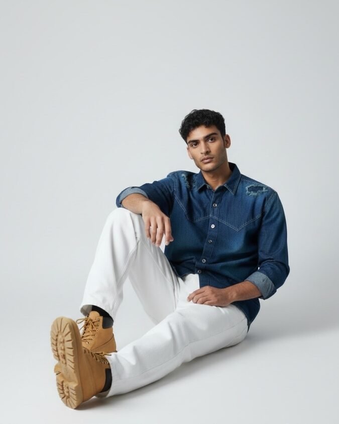 Men’s Dark Blue Faded Denim Shirt – Distressed Full Sleeve Casual Wear