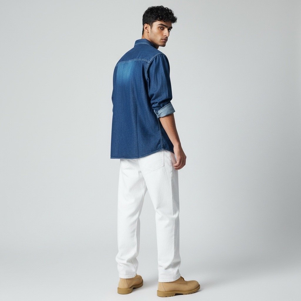 Men’s Dark Blue Faded Denim Shirt – Distressed Full Sleeve Casual Wear