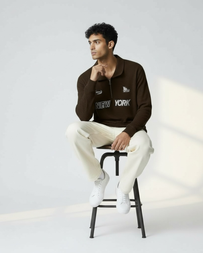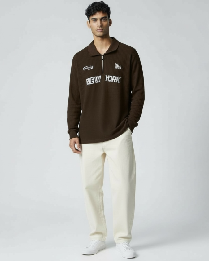 Men's Long Sleeve Waffle Textured Polo with Zipper – Coffee Brown-010