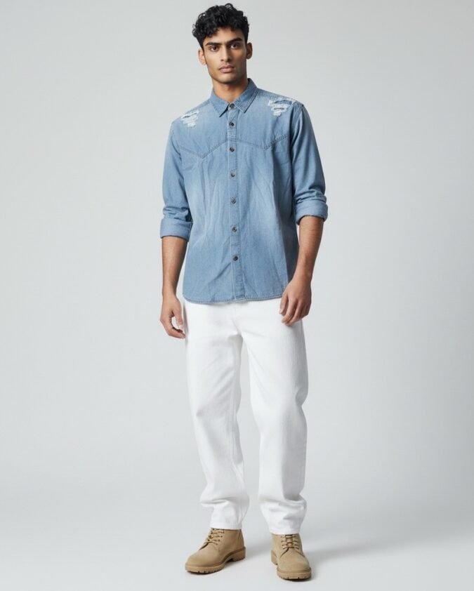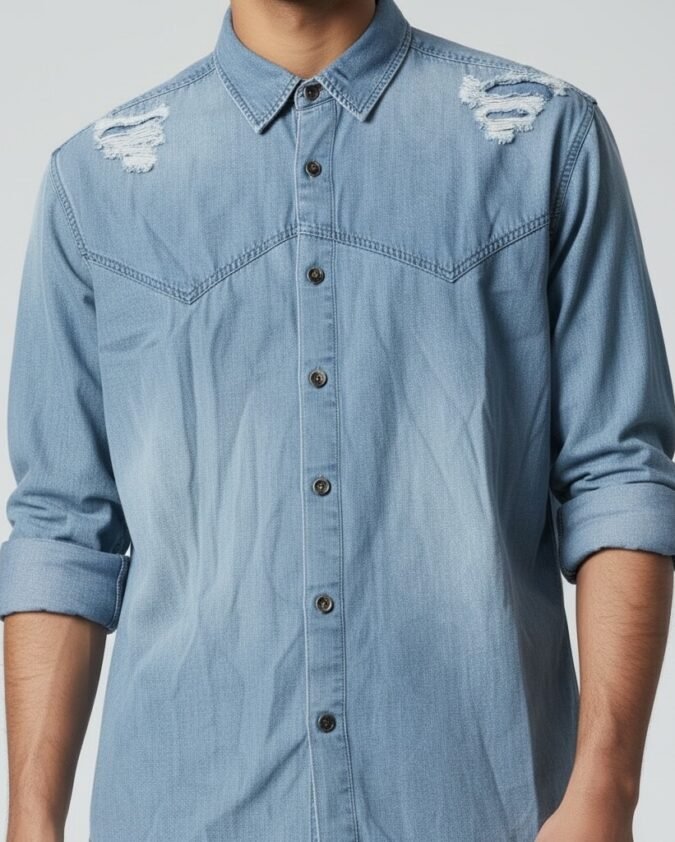 Men’s Light Blue Distressed Denim Shirt – Casual Full Sleeve